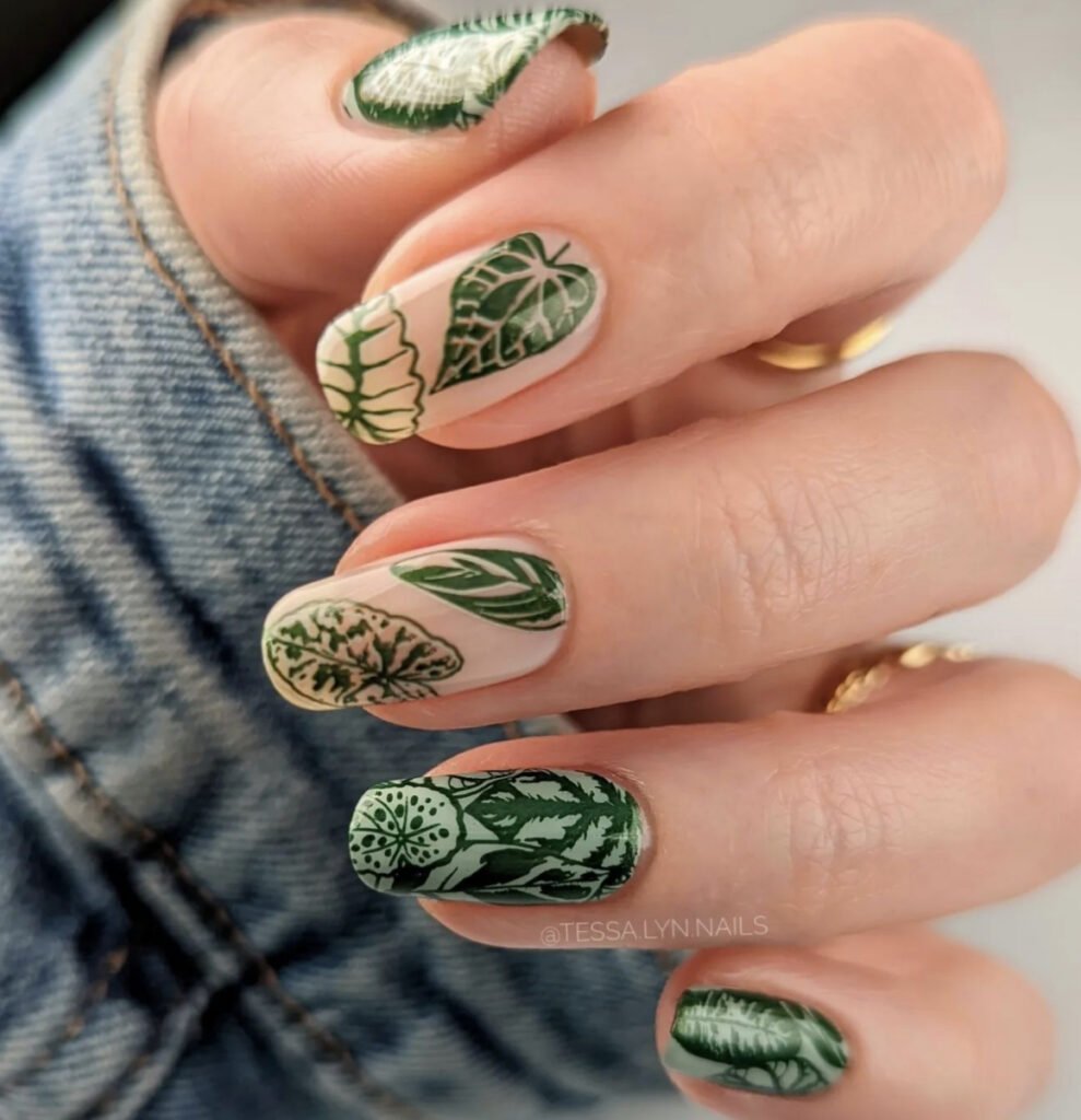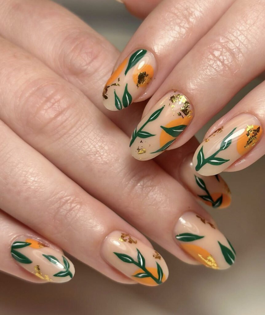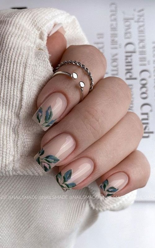 Keep it minimal with clear nails and delicate hand-painted leaves — soft, elegant, and classy.