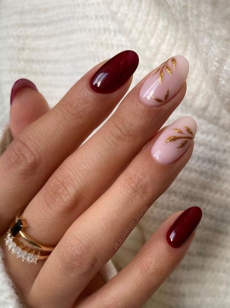 Deep burgundy nails paired with metallic gold leaf art create a rich and elegant autumn look.