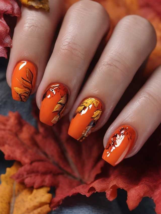 Burnt orange nails with golden leaf decals give a warm, earthy glow that screams autumn.