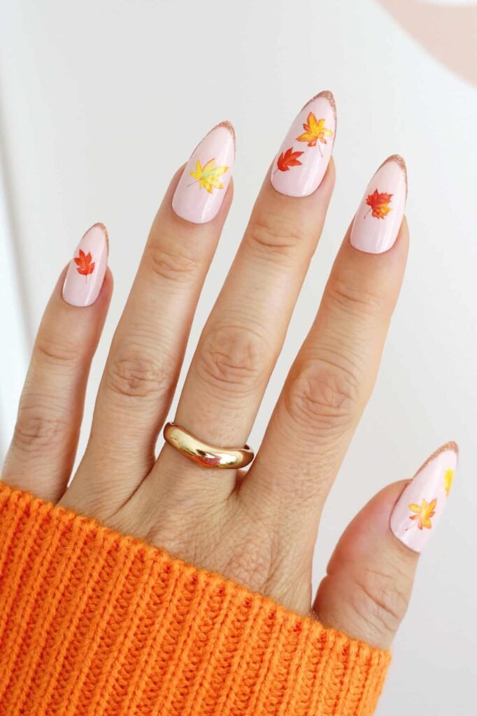 Warm shades of orange, red, and gold painted as falling leaves on nude nails create a timeless fall look.