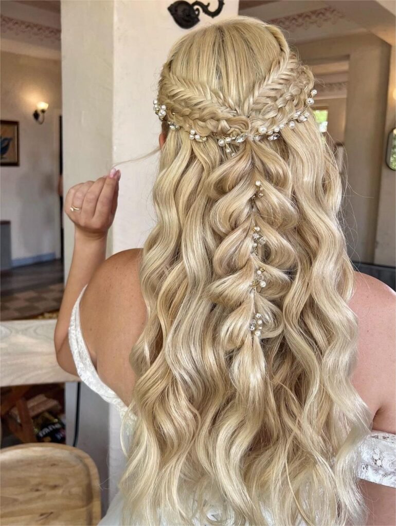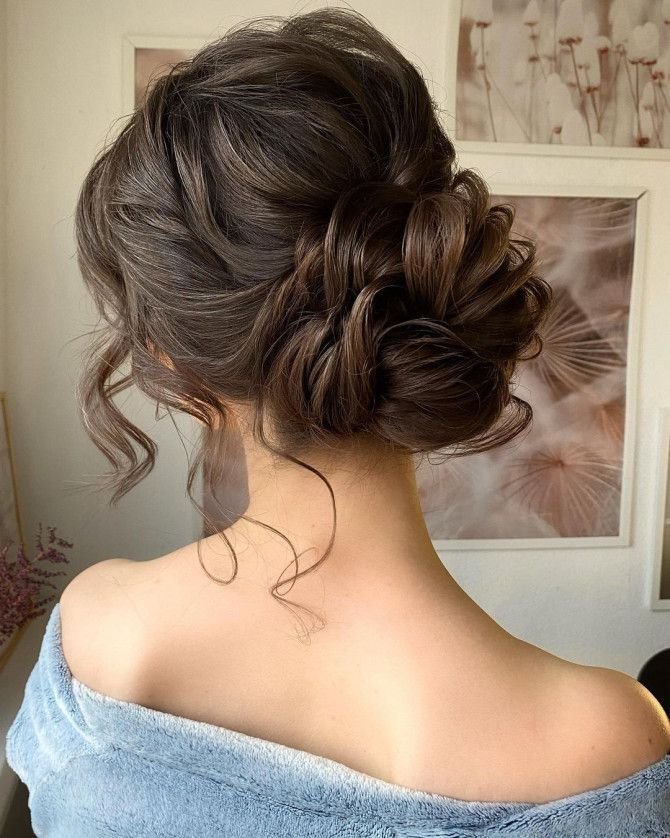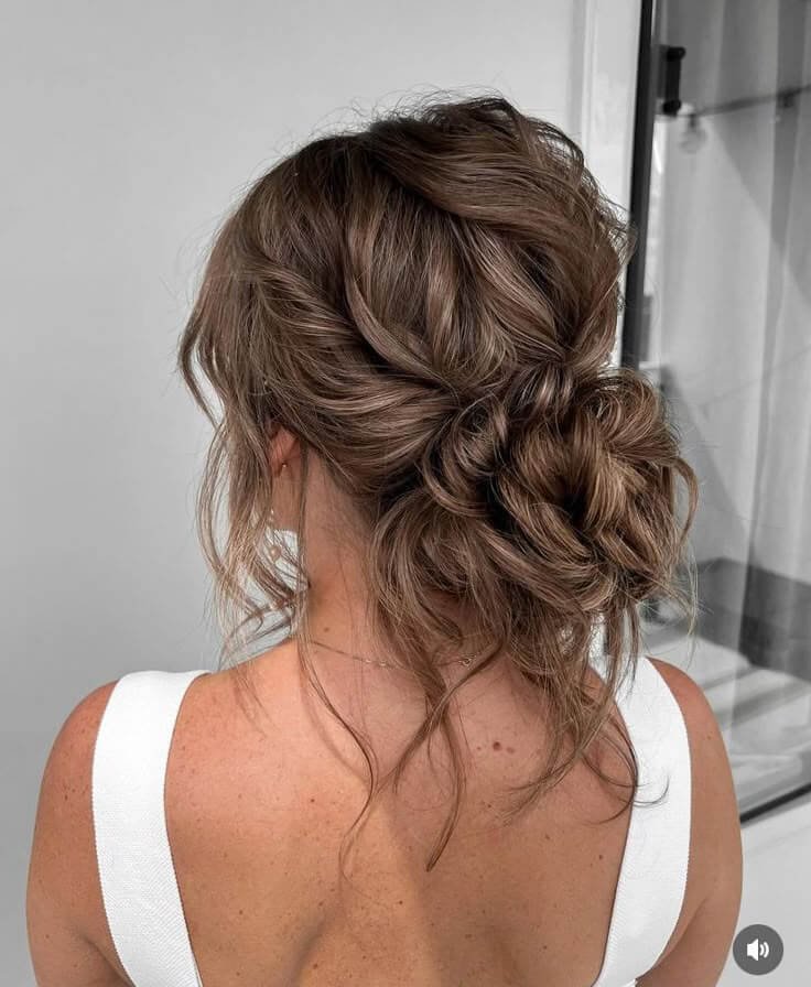 This soft and romantic side bun combines loose curls with a touch of braid magic. It’s an effortless updo that still looks intricate. Ideal for weddings, dances, or brunch dates.