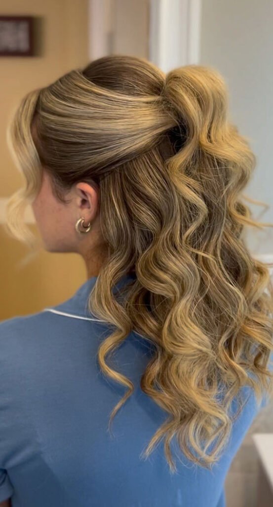Add a playful twist to your curls with a half-up ponytail. It’s glam but not over-the-top — perfect for any occasion. Just curl the ends for that extra bounce.