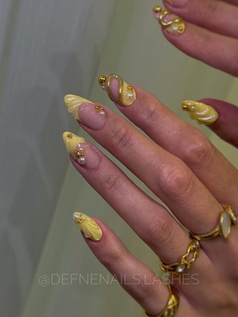 3. Butter Yellow 3D Almond Nails with Pearls and Gold