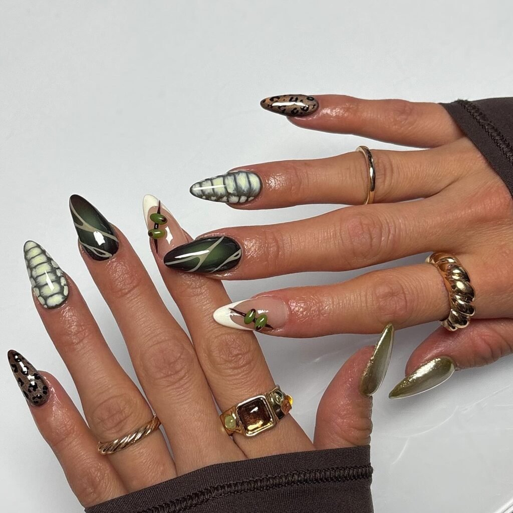 4. Olive Green Mixed Almond Nails with Trendy Animal Print
