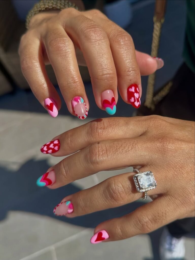 5. Cute Heart Almond Nails in Pink, Red, and Aqua