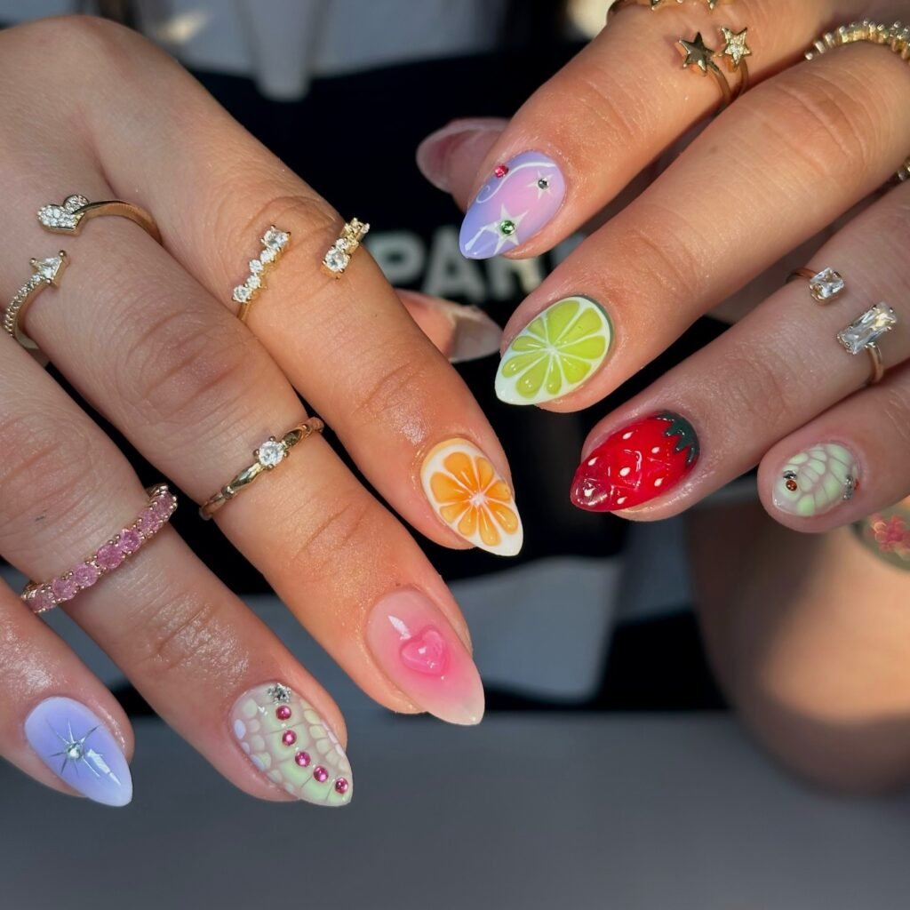 7. Fruity Almond Summer Nails with Citrus and Strawberry Art