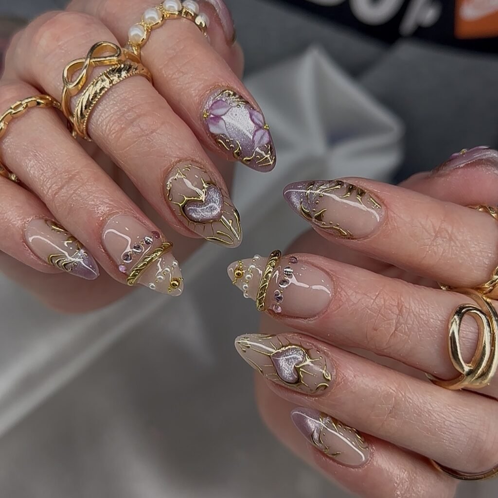 These ornate almond nails combine nude tones, lilac shimmer, gold detailing, pearls, and tiny gems for a manicure that feels truly luxurious. The delicate artwork gives this set a soft romantic vibe, while the metallic accents make it perfect for events and elevated summer looks. This is a beautiful choice for anyone who loves detailed nail art. Pin this design for an elegant almond manicure with princess energy.