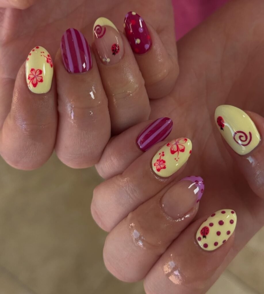 9. Playful Yellow and Pink Almond Nails with Ladybug Art