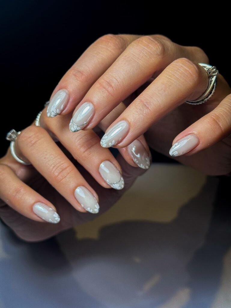 10. Pearly White Almond Nails with Delicate Floral Tips
