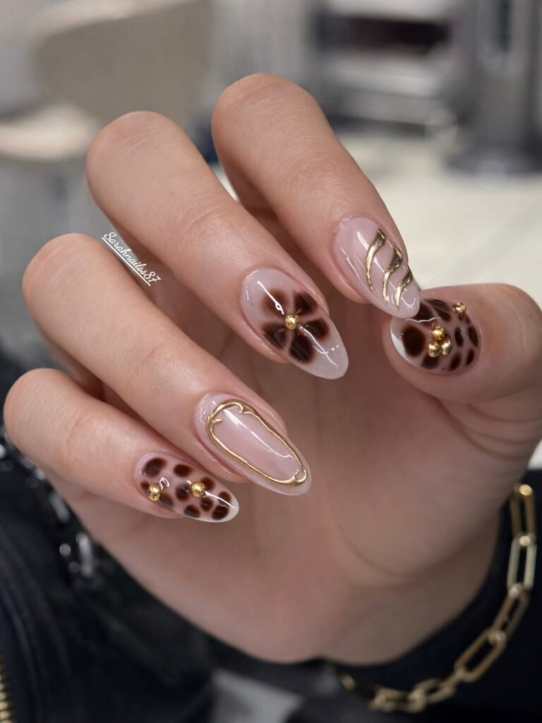 Soft nude almond nails meet rich brown tortoiseshell details, tiny gold studs, and delicate metallic lines for a look that feels both luxe and wearable. This spring brown nail design is perfect for anyone who loves neutral manicures with a little extra art. It balances classy everyday style with stunning detail, making it ideal for brunch, workdays, date nights, and even special events.