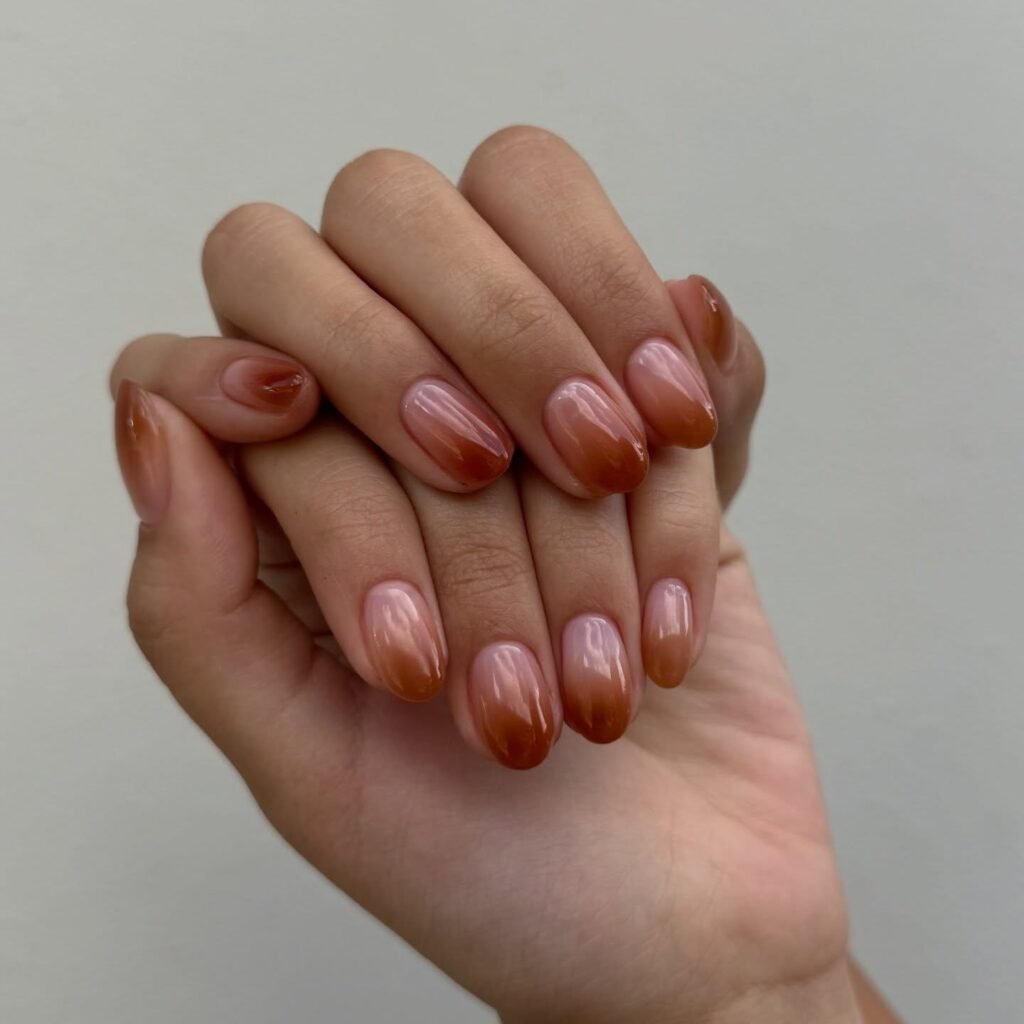 If minimal nail looks are more your style, this glossy caramel brown gradient is an easy favorite. The soft ombre effect adds warmth without overpowering the natural pink base, giving you a clean and classy everyday manicure. These spring brown nails are perfect for short to medium lengths and pair effortlessly with casual outfits, office wear, or any simple beauty look you want to keep chic.