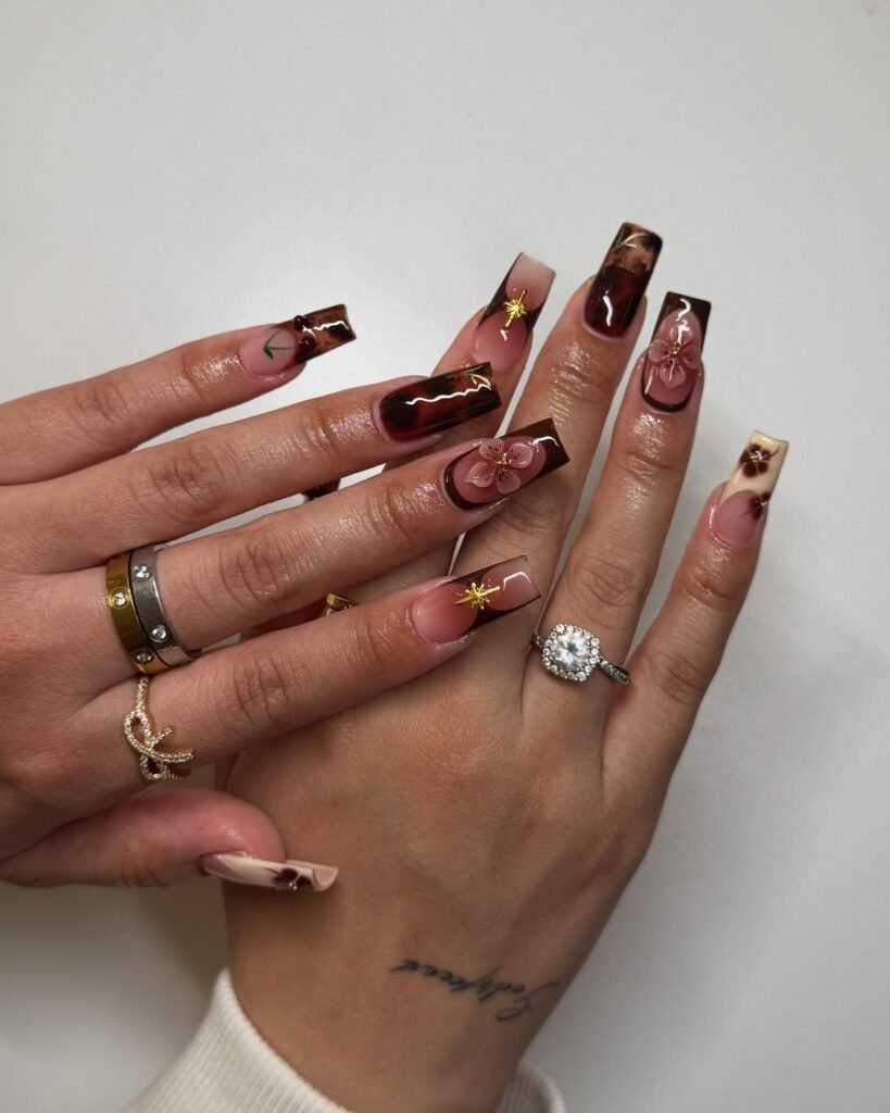 Long square nails give this rich brown manicure a dramatic edge, while floral accents, translucent layers, and tiny gold stars keep it soft enough for spring. This design is perfect if you love detailed nail art that still feels wearable and elegant. The warm chocolate tones look stunning against neutral outfits, and the glossy finish makes every small detail stand out beautifully in photos.