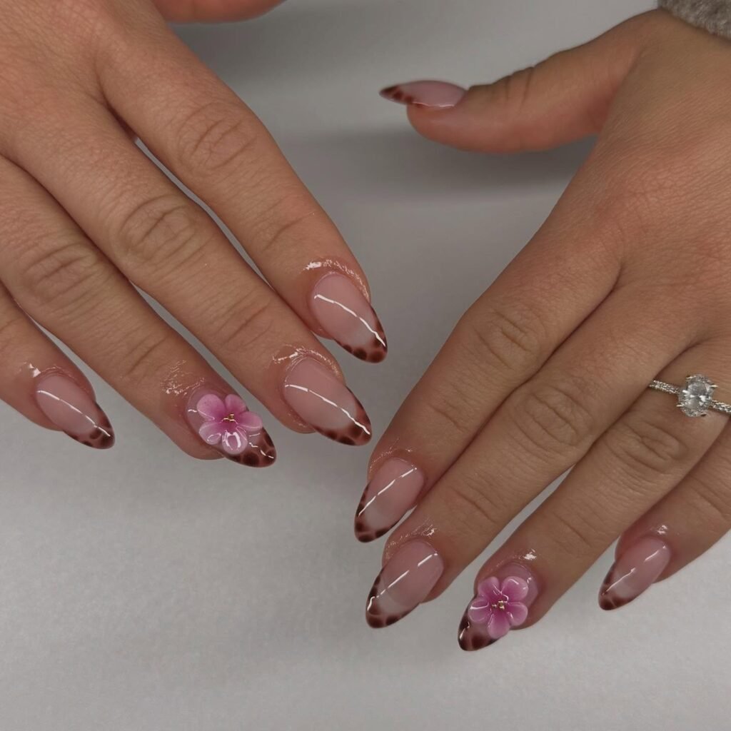 These soft pink nude nails with airy brown tips and raised floral accents are a dreamy choice for spring. The design feels light, feminine, and elegant, while the brown edging keeps it grounded and easy to wear. If you want classy spring brown nails that still feel romantic, this manicure offers the perfect blend of delicate detail, soft texture, and subtle seasonal color.
