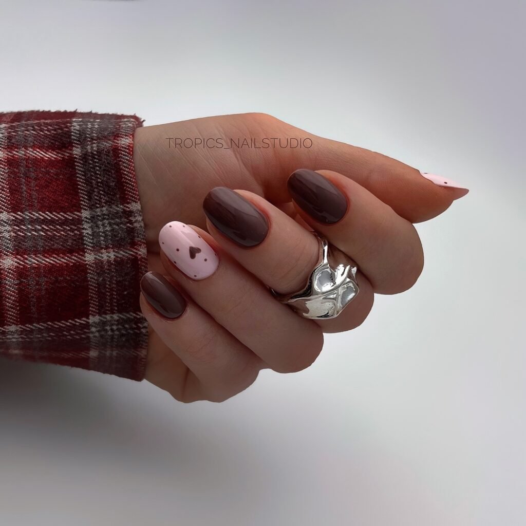 This short dark brown manicure with a pale pink heart accent is simple, adorable, and perfect for anyone who loves understated nail art. The glossy finish keeps it polished, while the tiny heart adds a fun Pinterest touch. It is an easy idea to save if you want spring brown nails that feel cute, easy to maintain, and wearable enough for school, work, or everyday errands.