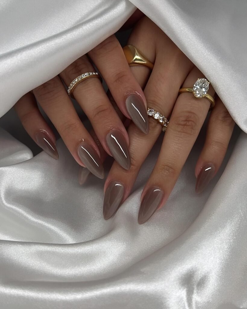 Sometimes the best spring brown nails are the simplest ones, and this glossy taupe set proves it. The sleek almond shape adds sophistication, while the cool brown tone keeps the look modern, soft, and versatile. This manicure is ideal for anyone who wants a polished neutral that works for daily life, weddings, dinner dates, or even a clean and minimal beauty aesthetic.