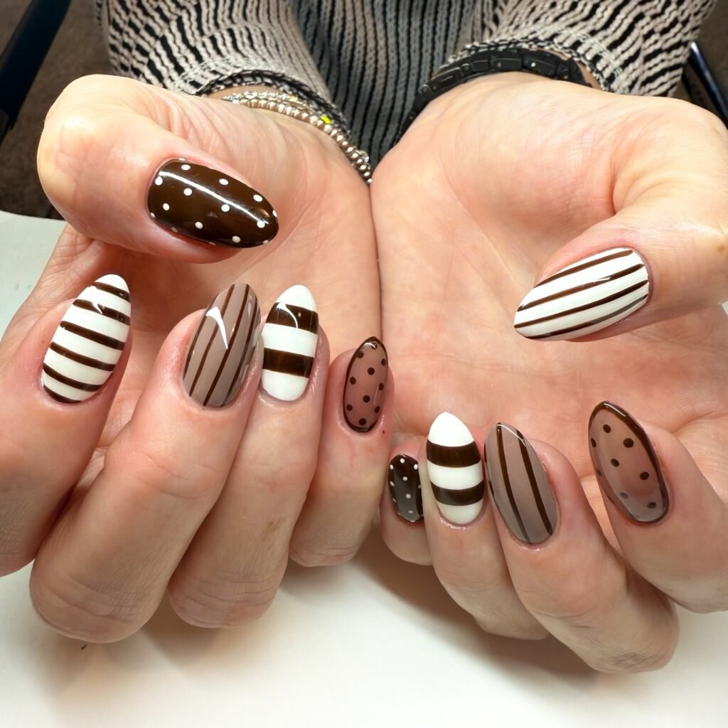 This playful mix of chocolate brown, creamy white, and mocha taupe proves that spring brown nails can feel bold and fresh at the same time. Stripes, dots, and graphic patterns create a fun statement without looking too loud. If you love modern nail art with a polished finish, this manicure is a great choice for Pinterest boards, fashion lovers, and stylish everyday outfits.