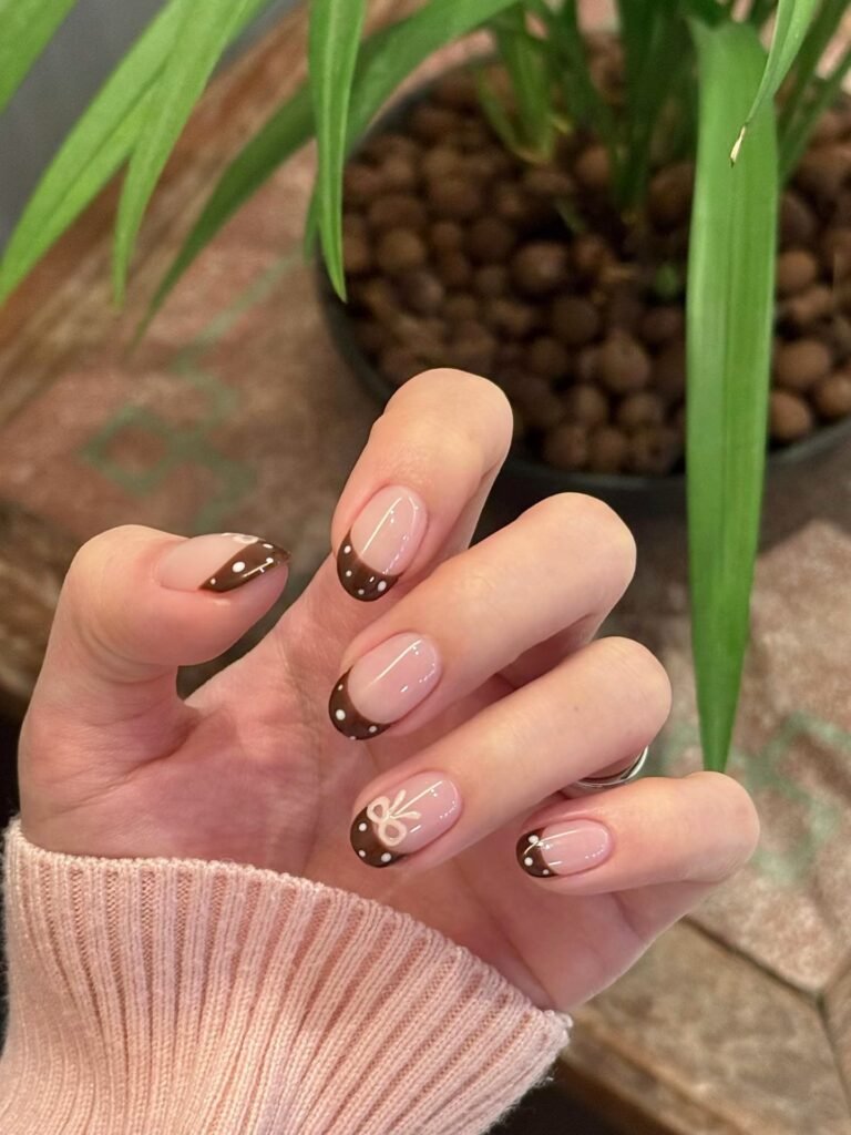Short nails can still be incredibly cute, and this brown French tip design is proof. The sheer nude base, tiny white dots, and dainty bow detail create a sweet spring look that feels fresh and playful. If you want brown nails that are easy to wear but still look special on Pinterest, this manicure is a lovely option for everyday styling, coffee runs, and weekend photos.