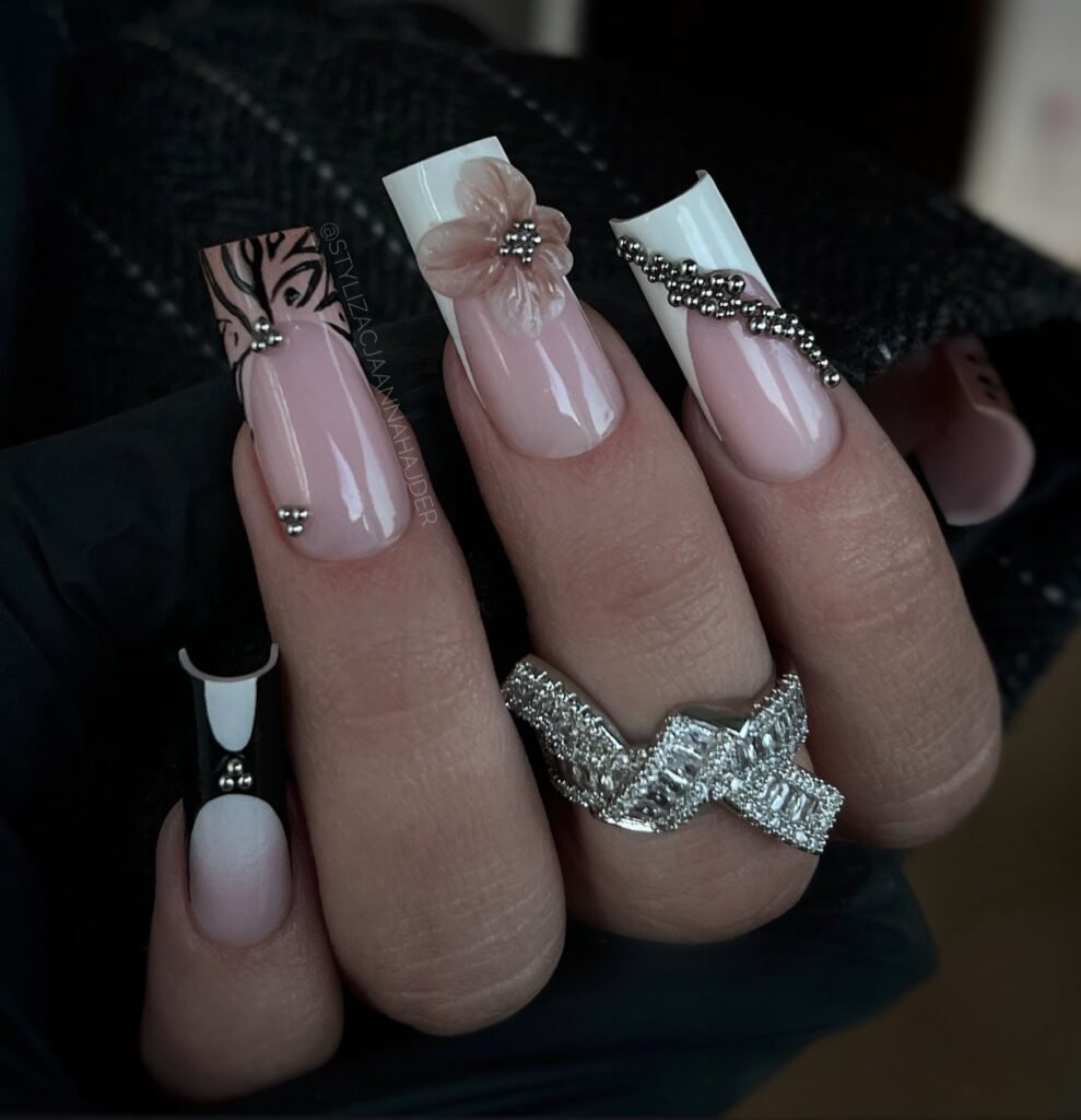 For a glam take on spring neutrals, this pink and white set adds sculpted flowers, silver beads, and sleek French details. The look is crisp, elevated, and ideal for anyone who loves statement nails with a refined finish. While it leans soft and pretty, the overall palette still works beautifully with brown toned spring style, especially alongside cozy knits, gold jewelry, and simple monochrome outfits.