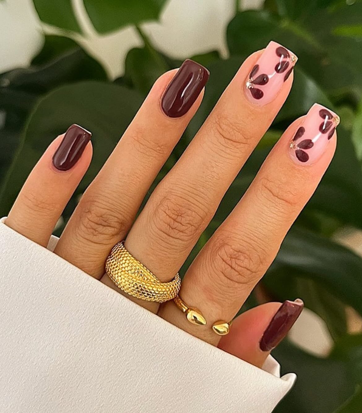 Deep espresso nails paired with soft pink accent nails create a stylish contrast that feels trendy yet classic. The petal art adds movement and a subtle floral vibe, making this design perfect for spring without relying on bright colors. If your vibe is chic, moody, and feminine, this manicure delivers a sleek look that photographs beautifully and instantly upgrades even the simplest outfit.