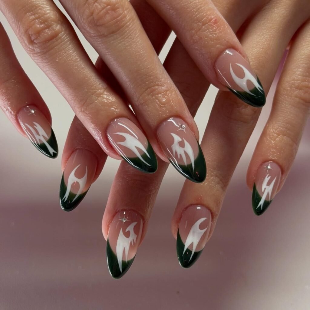 French tips do not always have to be classic, and this green flame-inspired version proves it. The deep forest edge adds drama, while the white flame detailing brings movement and a cool graphic finish. Tiny crystals near the cuticle keep the look subtly bedazzled without overpowering the design. Pin this set if you want a modern French manicure that feels edgy, sleek, and surprisingly wearable.