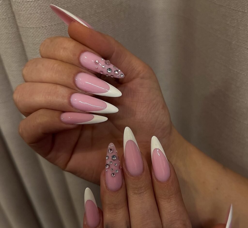 Soft pink and crisp white make this bedazzled French tip manicure feel timeless, but the scattered rhinestones add the perfect Pinterest-worthy sparkle. The long almond shape keeps the look elegant and feminine, making it ideal for bridal events, birthdays, or date nights. If you love classy nail ideas with a glamorous twist, this design is an easy save for your next salon appointment.