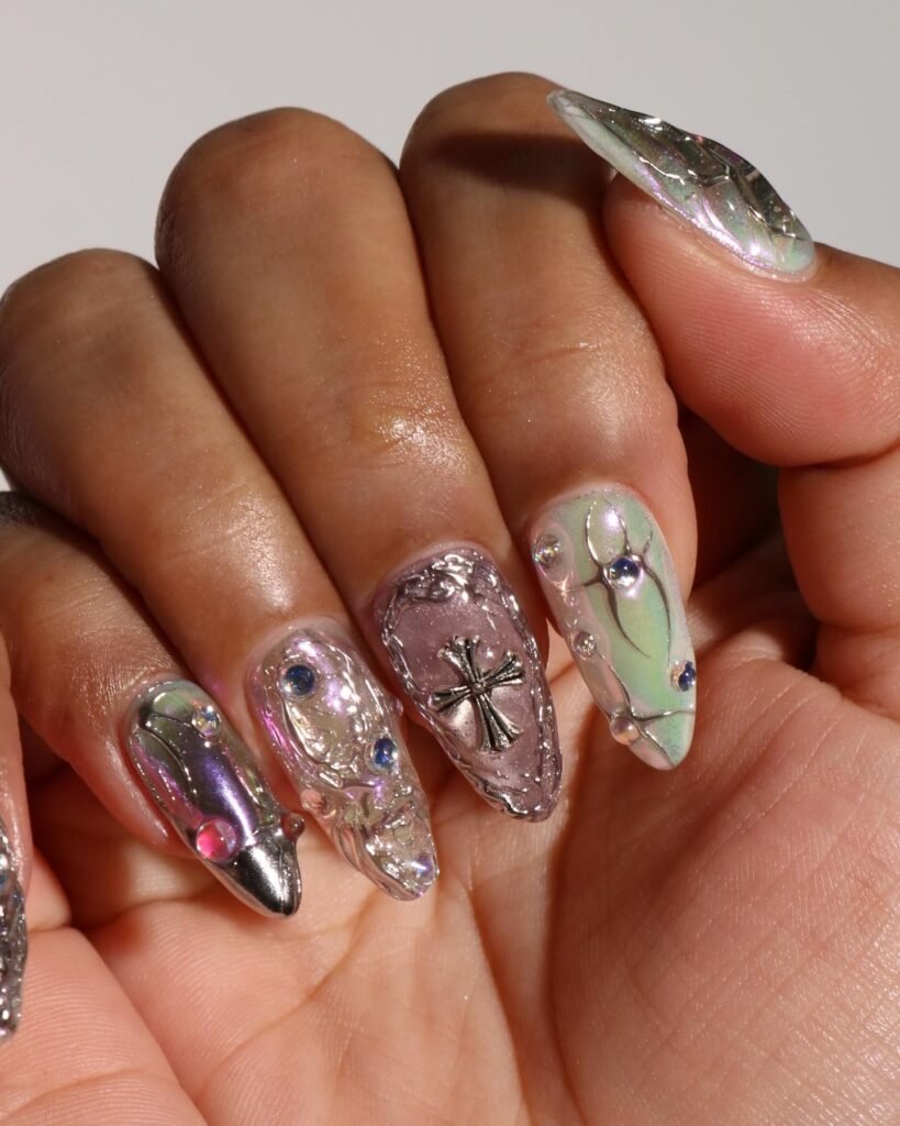 This chrome-heavy design brings futuristic energy to bedazzled French tip nails. The iridescent sheen, silver framing, and tiny crystal accents create a cool-toned, almost celestial finish that looks amazing in close-up Pinterest photos. One accent nail with a cross detail adds even more attitude without overwhelming the set. If you love edgy glam, this manicure is the perfect mix of metallic shine and artistic texture.