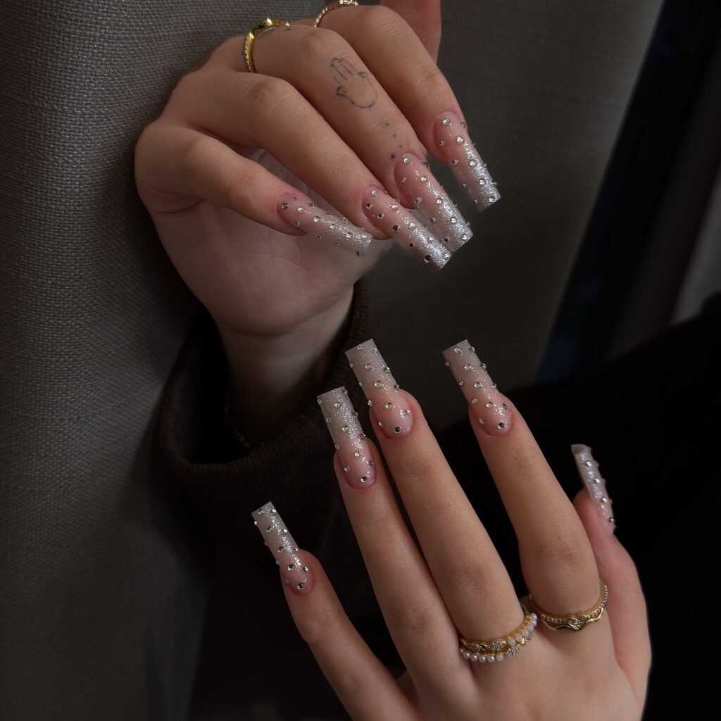 If dramatic nails are your thing, this glitter-packed square set is pure statement beauty. A sheer pink base melts into icy silver sparkle, while crystal accents catch the light from every angle. This is the kind of manicure that instantly elevates holiday outfits, party looks, and New Year glam. Pin this if you want bedazzled French tip nails that feel bold, luxe, and unapologetically extra.