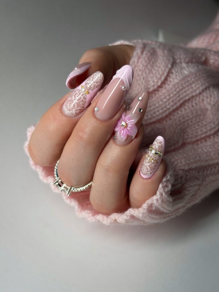 Delicate, soft, and ultra-feminine, this pink set is perfect for Pinterest boards filled with coquette, bridal, or spring nail inspiration. Lace-like white art, tiny pearls, and a 3D flower give the manicure a dreamy handmade feel, while the glossy nude base keeps it elegant. Save this design if you want bedazzled nails that look sweet and romantic but still feel refined enough for special moments.