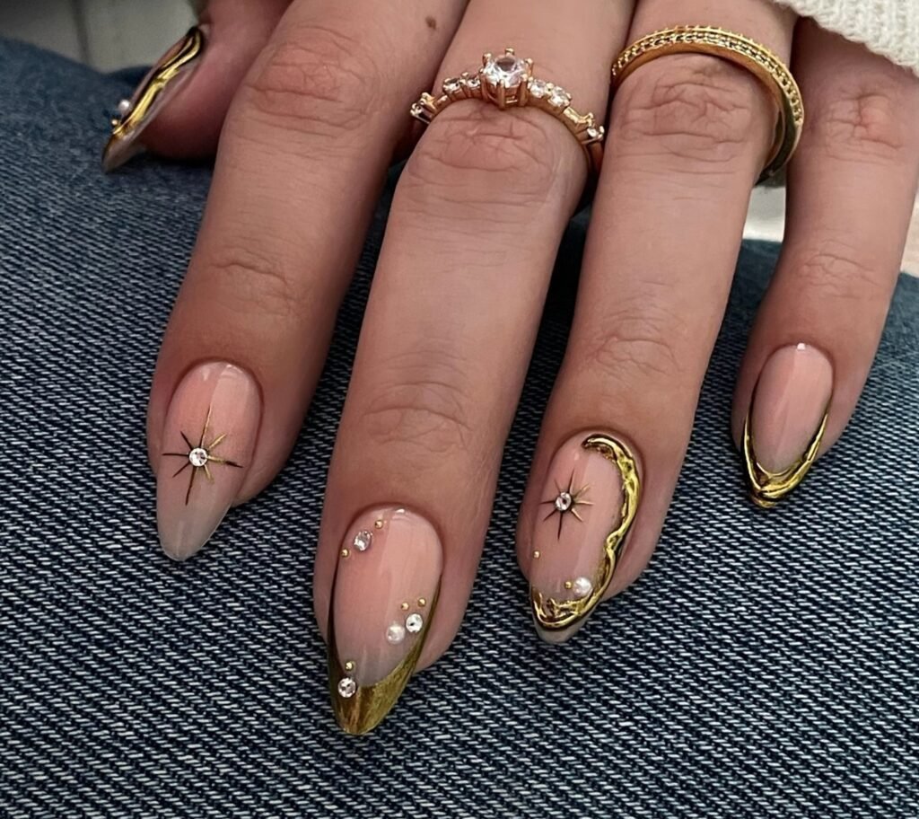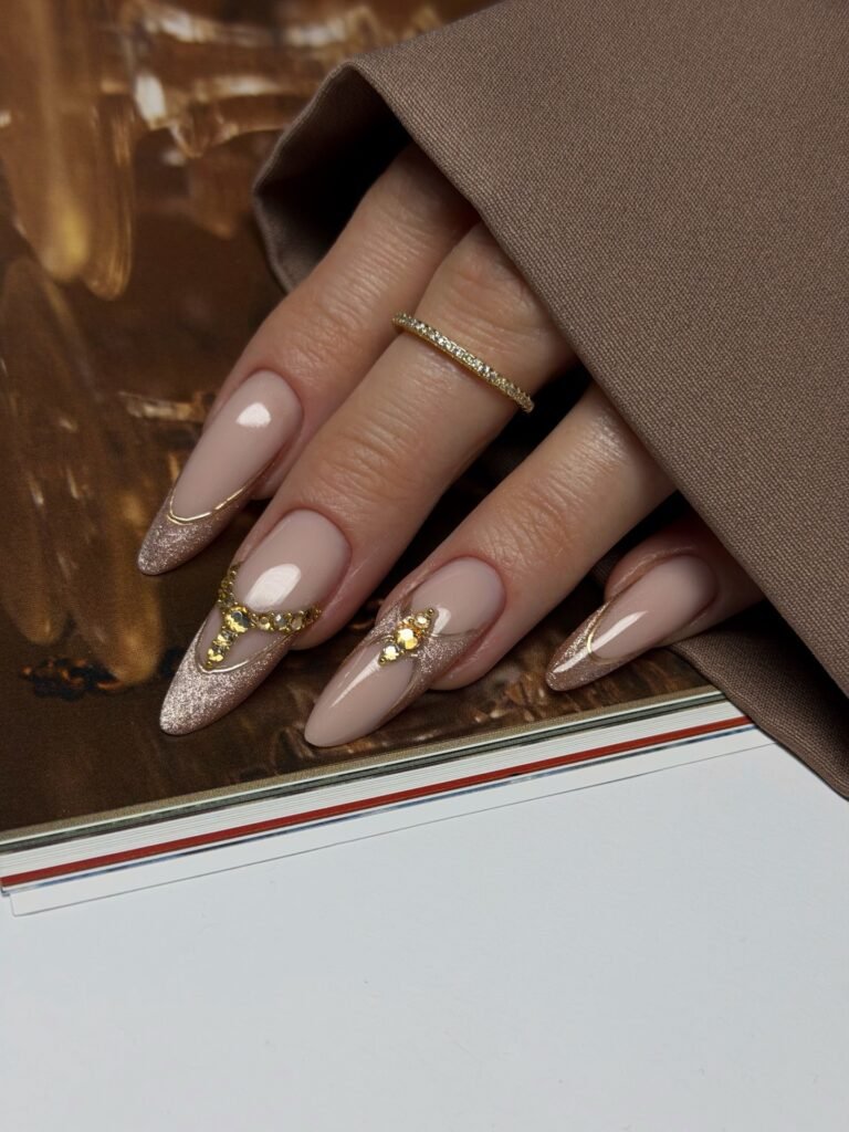 If your style is more understated luxury, this nude and gold French tip design is a must-pin. The soft neutral base feels clean and wearable, while fine gold outlining and glittery tips add a polished, expensive finish. Small crystal details bring just enough sparkle without taking away from the sophistication. This is the kind of manicure that works beautifully for weddings, work events, and everyday glam.