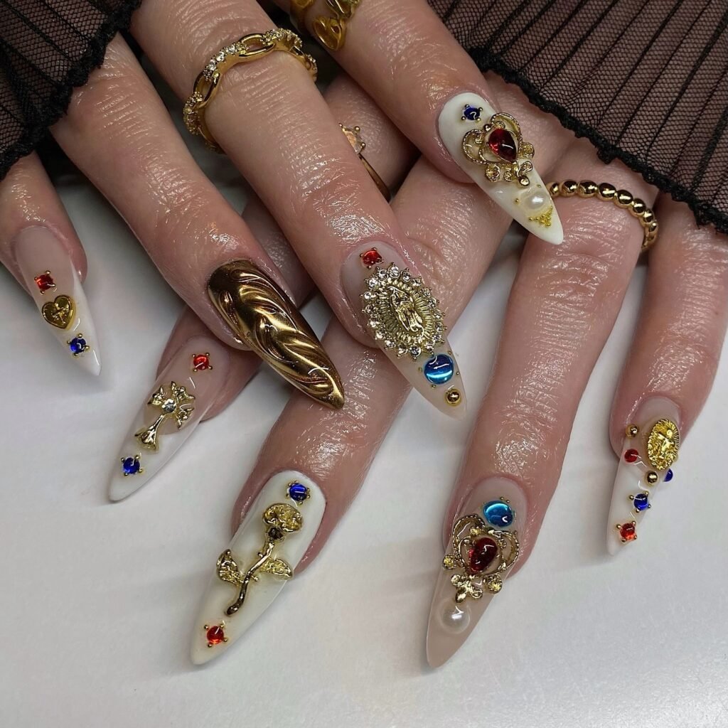 For anyone who loves maximalist nail art, this ornate set is unforgettable. White pointed tips become a canvas for gold embellishments, gemstone colors, pearls, and sculptural details that feel vintage and regal. It blends French tip structure with editorial drama, making it perfect for special occasions or standout content shots. Save this design if your dream manicure leans gothic, romantic, and richly detailed.