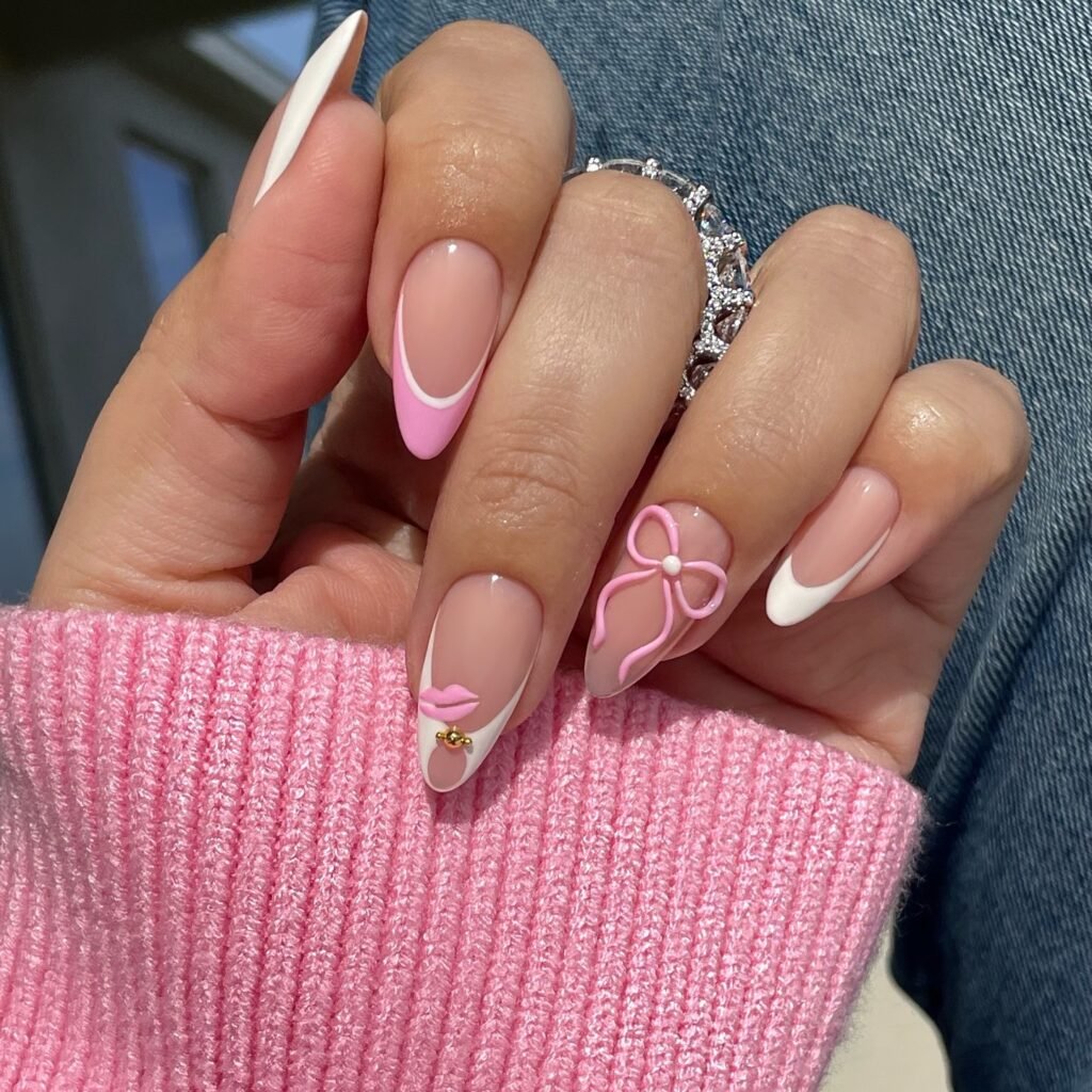 Cute meets clean in this pink and white French tip design with playful 3D details. The soft blush base keeps everything fresh, while the sculpted flower, pink lips, and curved tips make the set feel fun and flirty. It is perfect for Valentine season, brunch dates, or anyone building a feminine nail inspo board. Pin this look if you want something sweet, trendy, and easy to personalize.