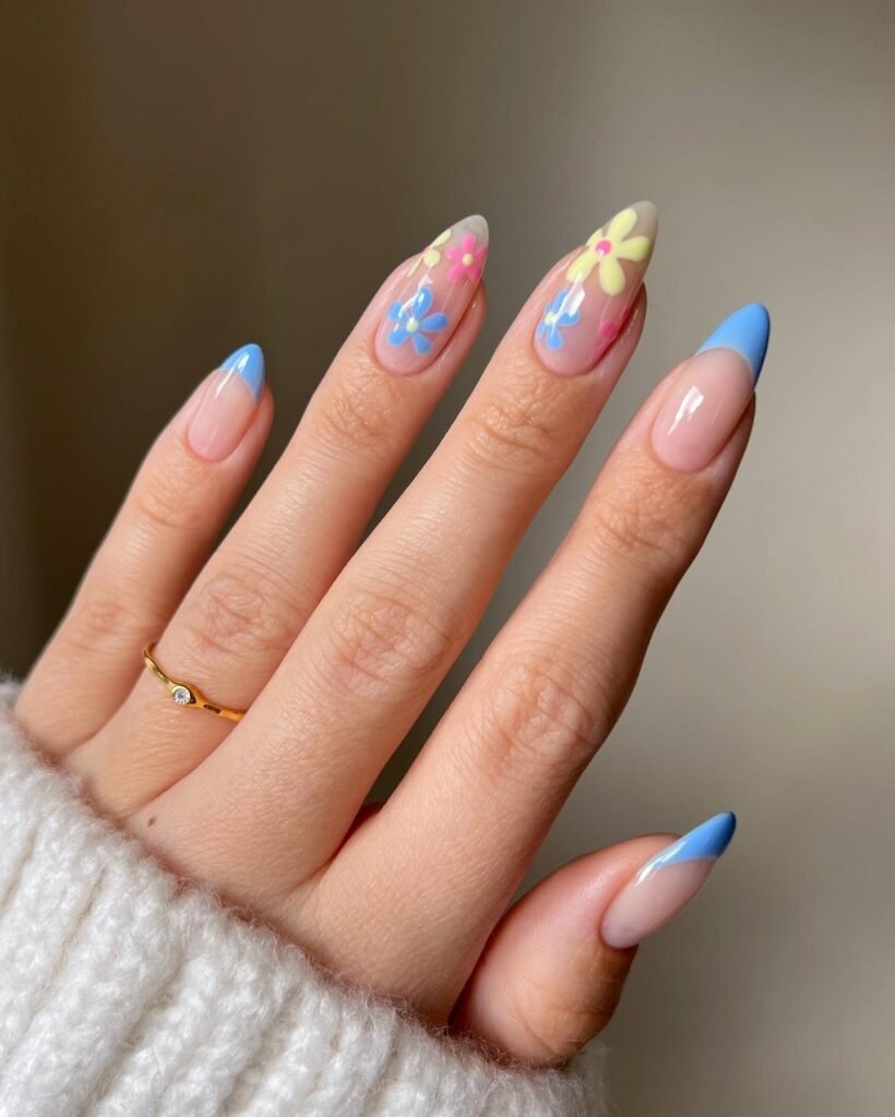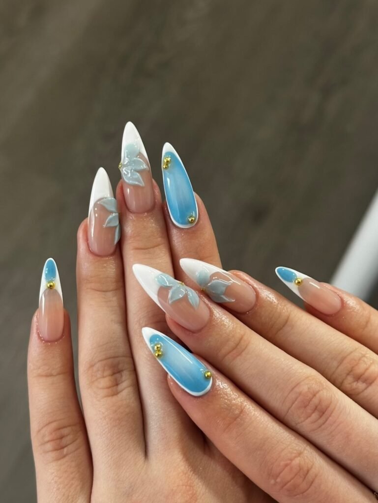 This soft blue blossom manicure blends sheer nude bases with airy French tips and delicate daisy accents for a fresh, feminine finish. The almond shape keeps the look elegant, while the pastel palette feels perfect for spring boards and dreamy Pinterest saves. It is a lovely choice for anyone who wants floral nail art that looks polished, playful, and easy to wear every day.