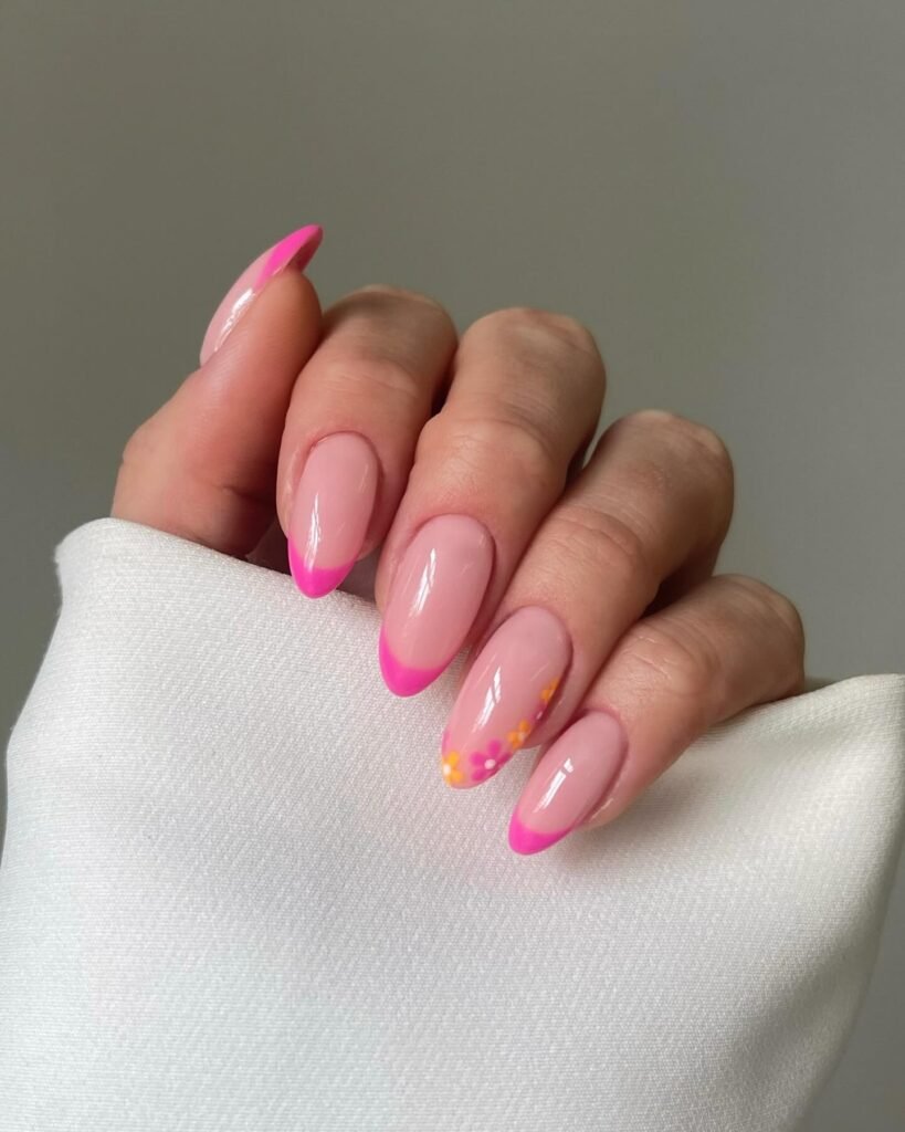 Bright pink French tips make this design instantly bold, while the tiny floral accents soften the look with a sweet, girlish charm. The glossy nude base keeps everything balanced, so the manicure still feels clean and modern. This is a great Pinterest friendly idea for summer, vacation mood boards, or anyone who loves colorful nails that remain chic, wearable, and beautiful.