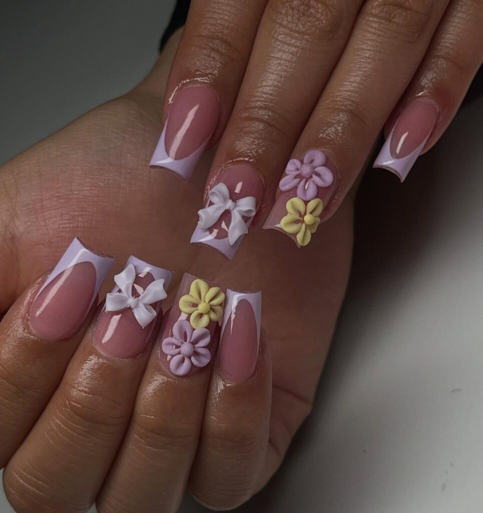 This romantic pink design stands out with sculpted 3D flowers, crisp French edges, and a glossy finish that feels polished and luxurious. The mix of soft blush and lilac tones adds depth without overwhelming the look, making it perfect for special occasions or elevated everyday style. Pinterest audiences will love how it balances elegance, texture, and feminine detail in one manicure.