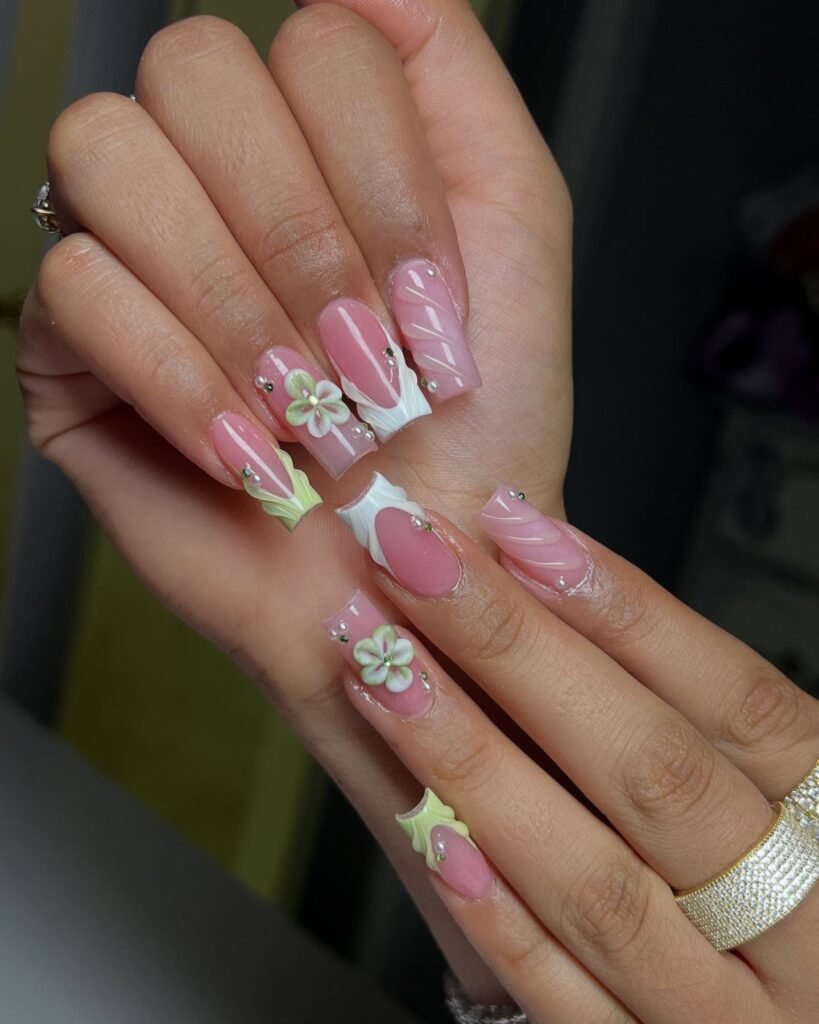 Soft green tones pair beautifully with blush pink and tiny floral accents in this fresh, nature inspired manicure. The pointed shape gives the design a sleek silhouette, while the pastel palette keeps it gentle and feminine. It is a lovely pick for spring, garden parties, or Pinterest users searching for a calming nail look that still feels creative and fashion forward.