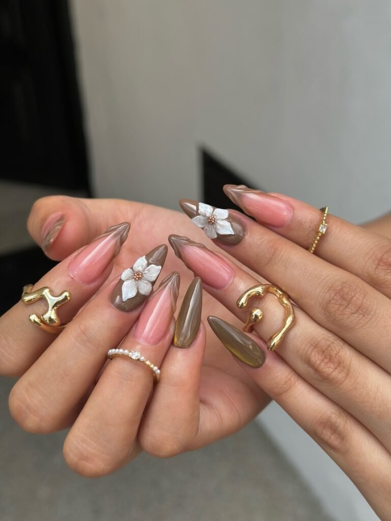 Warm mocha, nude, and metallic tones give this floral manicure a luxe, editorial feel. The elongated shape adds drama, while the sculpted blossoms and gold accents bring richness and contrast. This is a stunning choice for Pinterest users who prefer sophisticated nails with a fashion forward edge. It works beautifully for fall inspiration, special events, or elevated everyday style today.