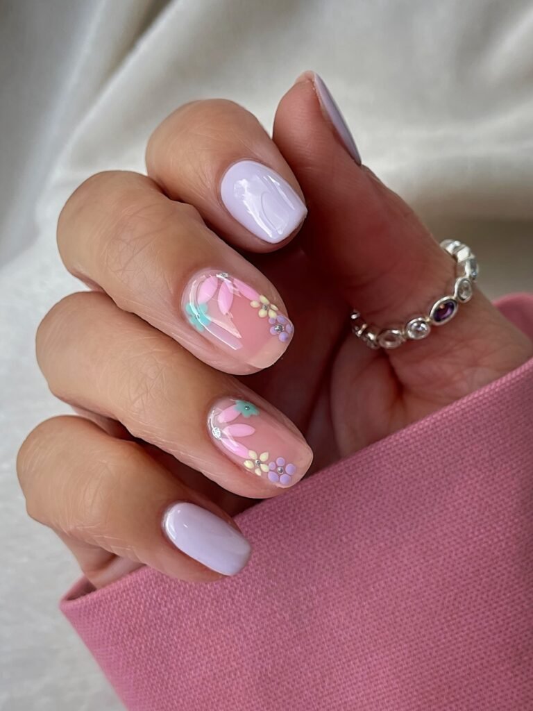 Lavender and blush tones give this short floral manicure a soft, cozy mood that feels effortlessly pretty. The rounded square shape makes it practical, while the tiny blossoms and glossy finish keep the design feminine and charming. It is ideal for everyday wear, bridal inspiration, or Pinterest users looking for a subtle nail idea that still looks detailed and thoughtfully styled.