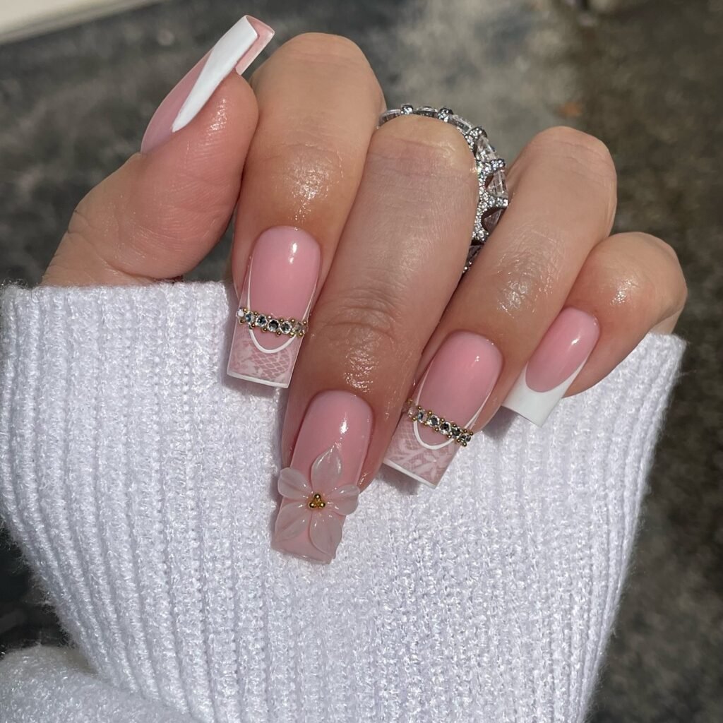 A square French base gets a glamorous update here with tiny rhinestone bands, crystal details, and soft raised flowers. The design feels bridal, polished, and a little bit statement making, which makes it ideal for celebrations or upscale everyday wear. If you love luxury nails for Pinterest inspiration, this look delivers sparkle, structure, and a romantic finish beautifully all at once.