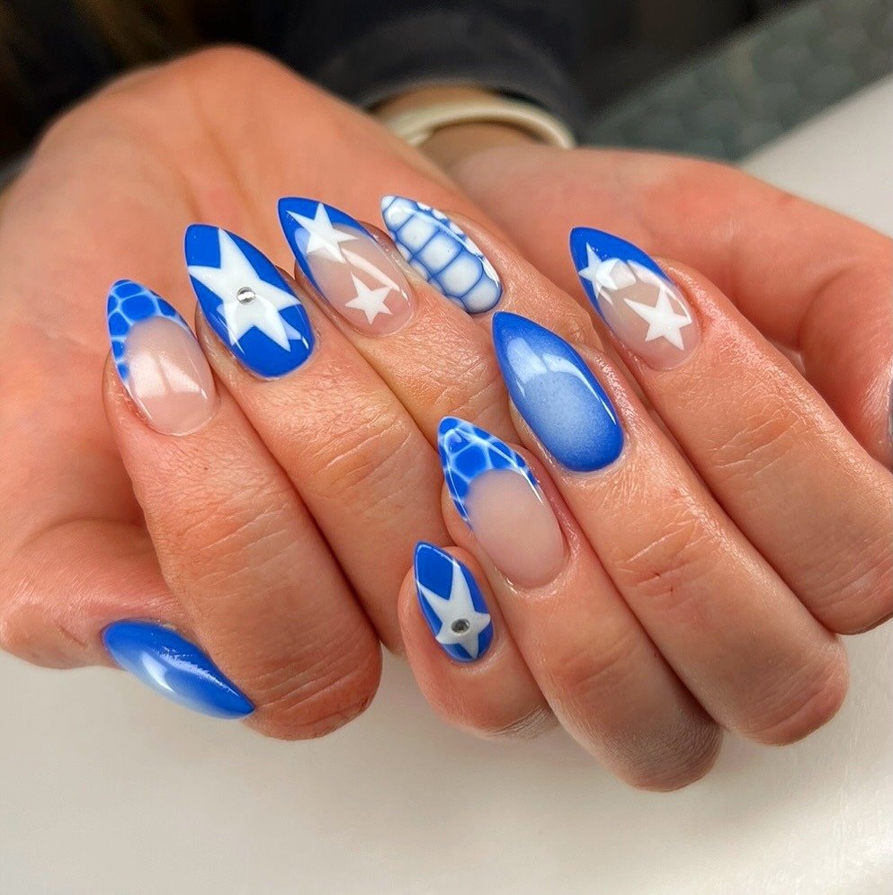 Bold cobalt blue nails with star and geometric accents make this manicure truly striking. The combination of solid color, negative space, and graphic patterns adds depth and personality. Ideal for statement lovers, this design is perfect for nights out or when you want your nails to be the center of attention.