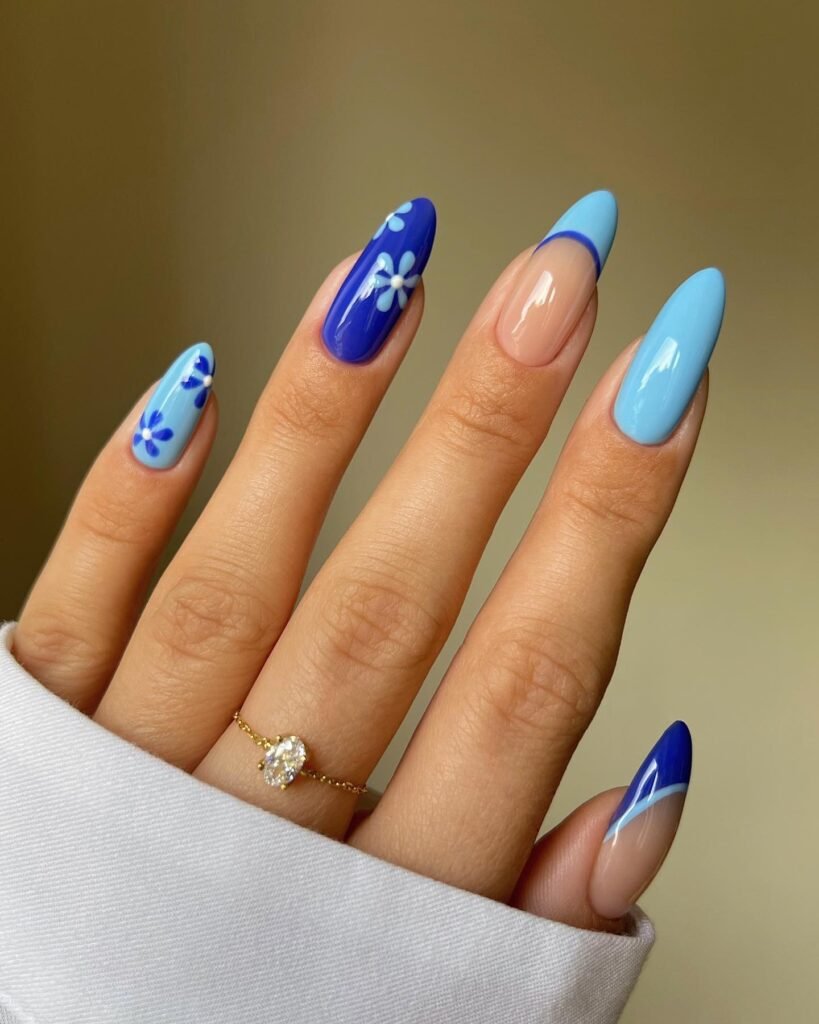 3.Mixed Blue Shades with Sweet Floral Nail Art