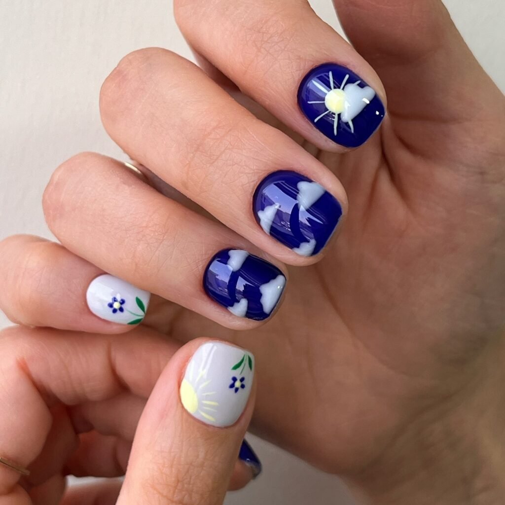 Whimsical sky-inspired nails featuring clouds, sunshine, and tiny floral accents bring a playful, dreamy vibe. The mix of deep blue and soft white creates contrast, while the hand-painted details make each nail unique. This cheerful design is perfect for creative spirits who love fun, storybook-inspired nail art.