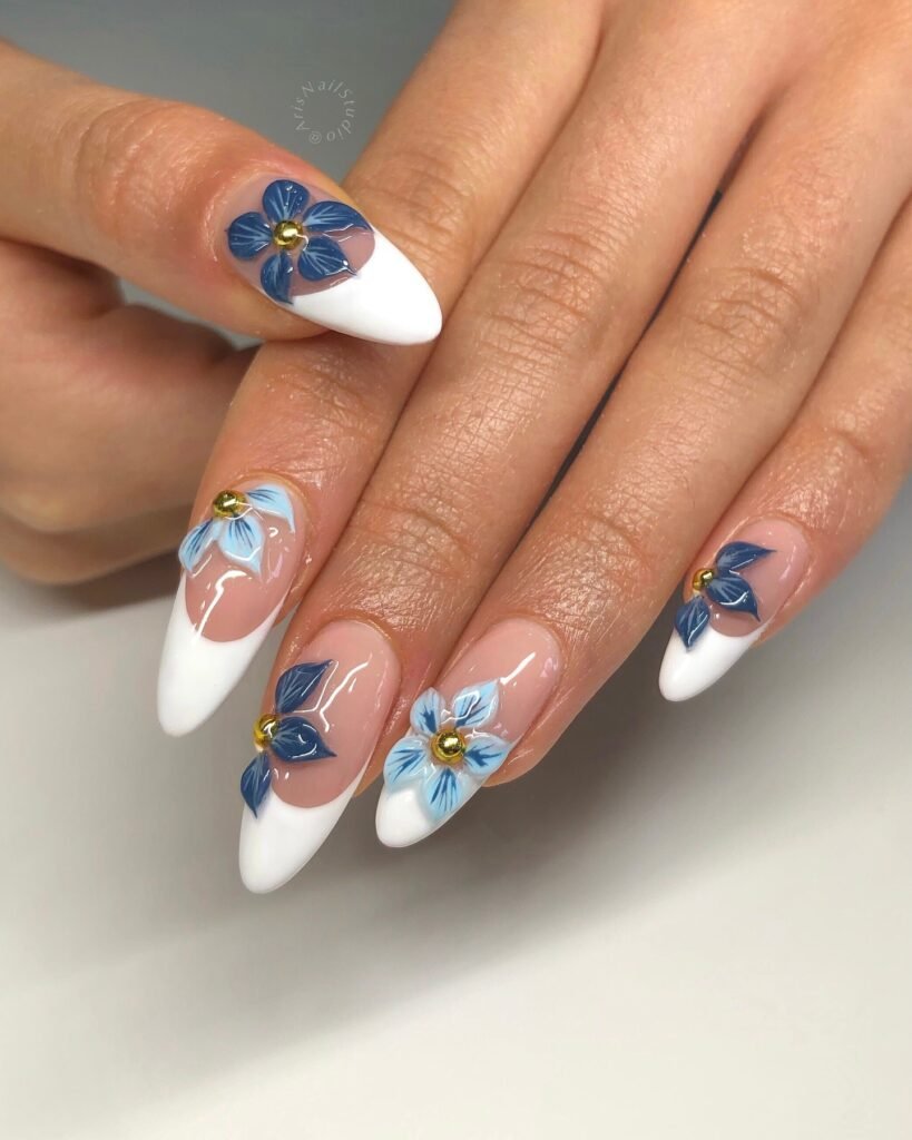 6.Classic White French Tips with Bold Blue 3D Flowers