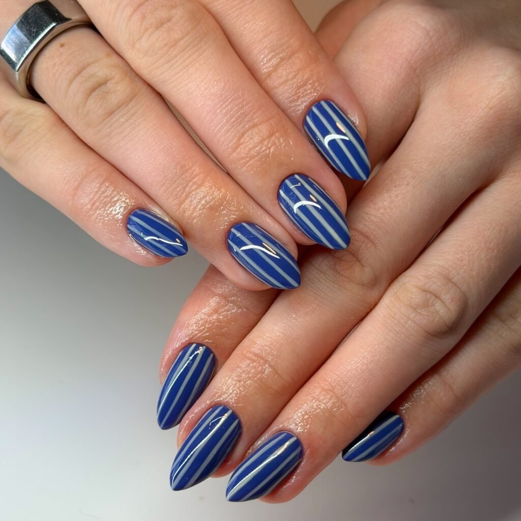9.Sleek Navy Nails with Modern Vertical Stripes