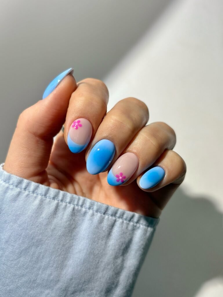 Soft blue ombré nails with tiny pink floral accents create the ultimate fresh spring manicure. The glossy almond shape paired with a sheer nude base keeps the look clean and feminine, while the bright blue tips add a playful pop of color. This design is perfect for brunch dates, vacations, or anyone loving soft yet eye-catching nail art.
