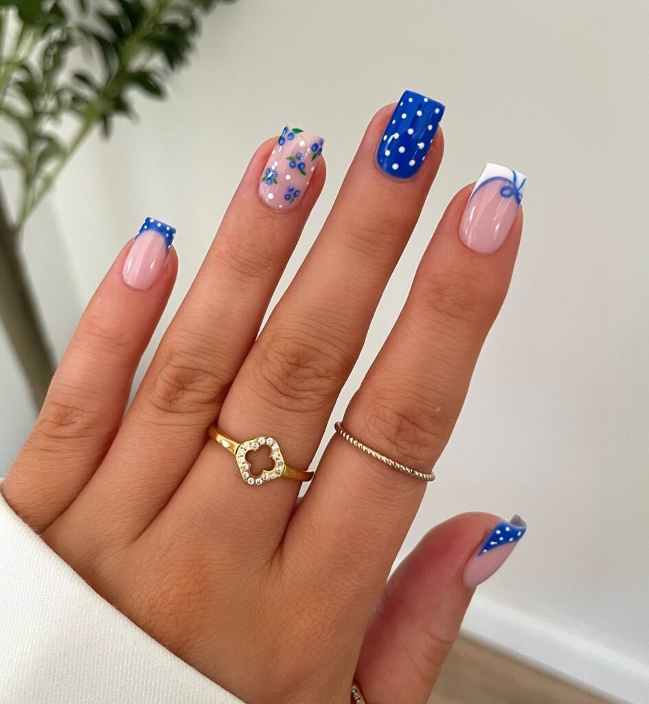 Blue French tips paired with polka dots and tiny floral details create a fun, retro-inspired manicure. The square shape enhances the playful vibe, while the combination of patterns keeps each nail unique. This look is perfect for creative personalities who love mixing classic styles with cheerful, eye-catching elements.