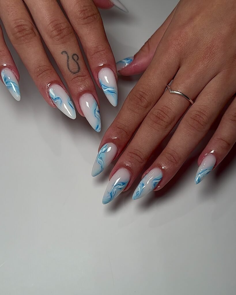 White and blue marble nails create a cool, ocean-inspired aesthetic that’s both calming and trendy. The fluid swirl patterns mimic waves, making this design perfect for summer or beach lovers. The pointed shape adds drama, while the soft blending of blue tones keeps the overall look balanced and sophisticated.