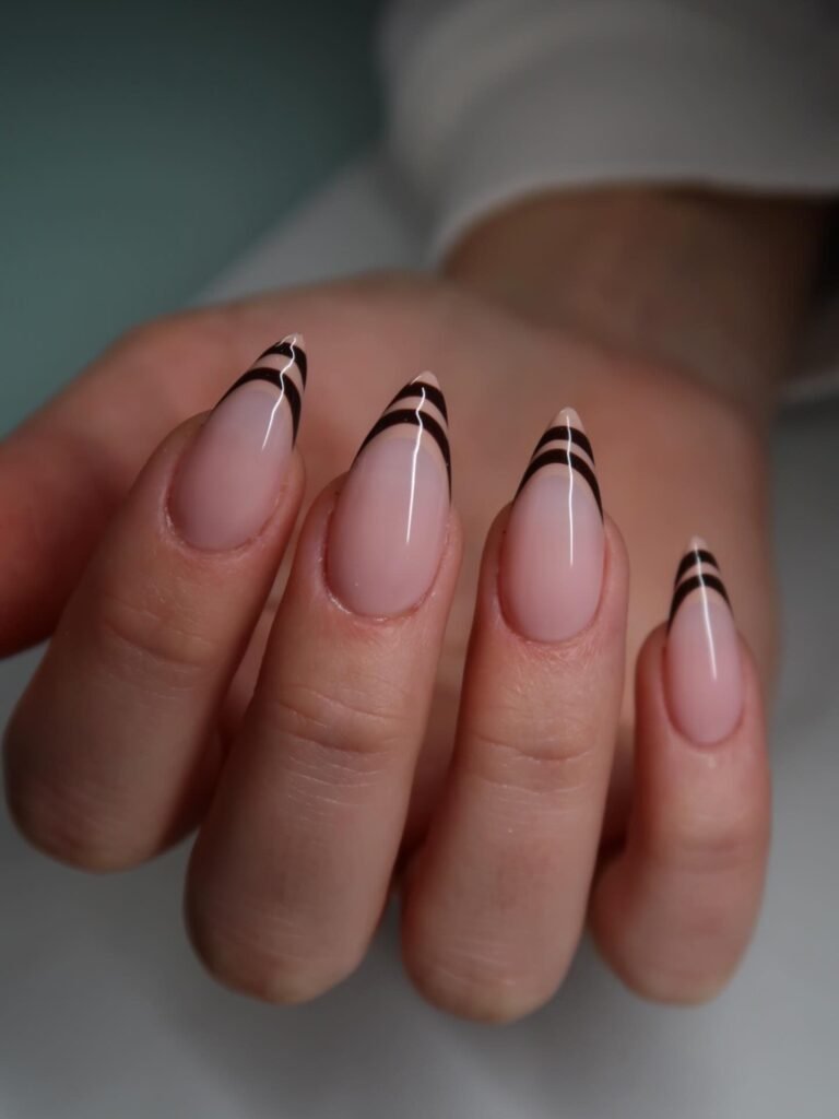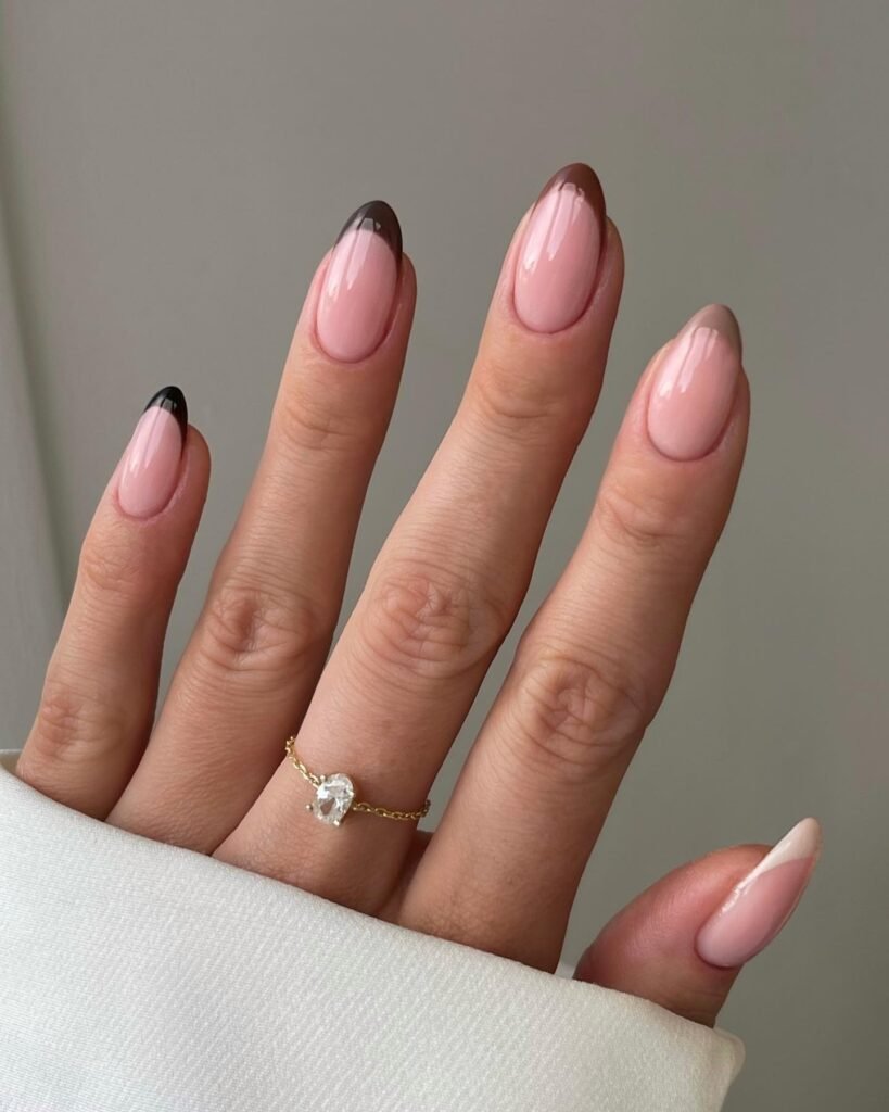 This manicure gives the classic French tip a bold update with dark brown edges on a soft pink base. The shape feels elegant and feminine, while the deep tips add contrast and sophistication. A minimal swirl accent makes the design feel fresh and artistic. It’s a perfect Pinterest idea for anyone who wants a modern neutral manicure with a slightly dramatic, fashion-forward edge.