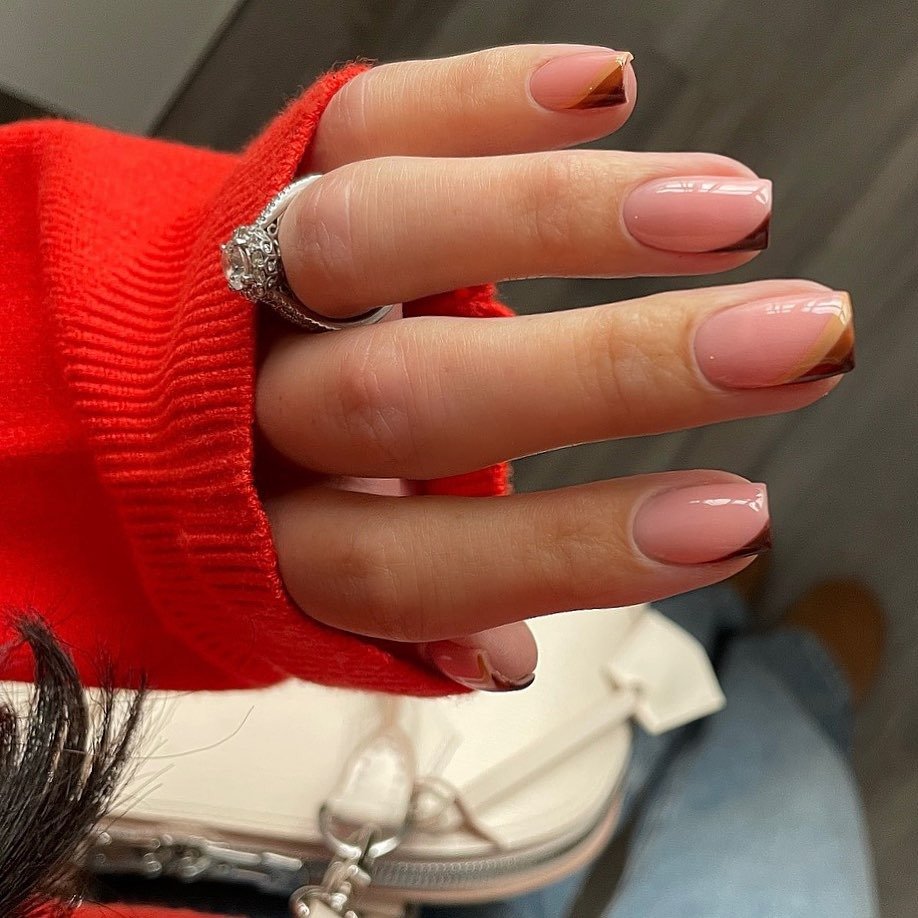 This elegant manicure blends a soft nude base with rich brown French tips for a clean and polished look. The short square shape makes it practical, while the glossy finish keeps it chic and modern. It’s the perfect Pinterest nail idea for everyday wear, cozy outfits, and anyone who loves a classy neutral manicure that still feels trendy, feminine, and effortlessly put together.