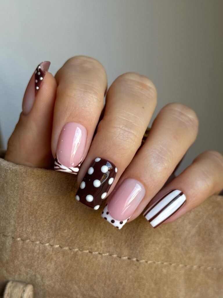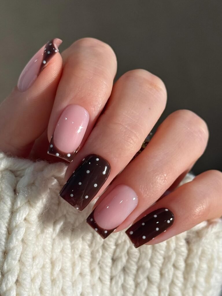 These chocolate polka dot nails bring a fun, retro-inspired vibe to the brown French tip trend. The glossy nude and dark brown combination feels sweet and stylish, while the white dot details add a playful finish. The square shape keeps the look modern and bold. This manicure is perfect for Pinterest lovers who want something cute, creative, and a little different from classic French tips.