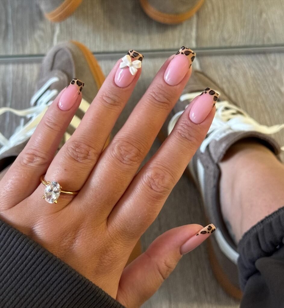 These leopard French tip nails are playful, stylish, and made for Pinterest boards full of trendy inspo. The soft pink base keeps the manicure pretty and wearable, while the animal print tips bring in a bold fashion statement. A tiny white bow adds a sweet finishing touch. This design is perfect for anyone who wants a cute, girly, and eye-catching manicure with personality.